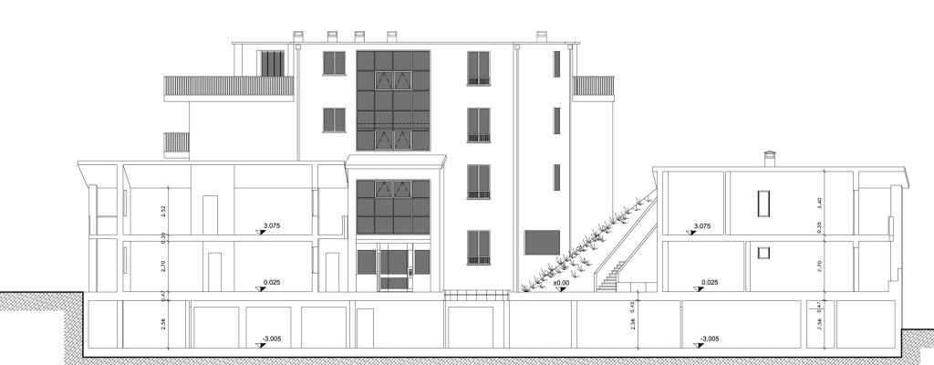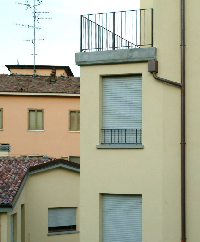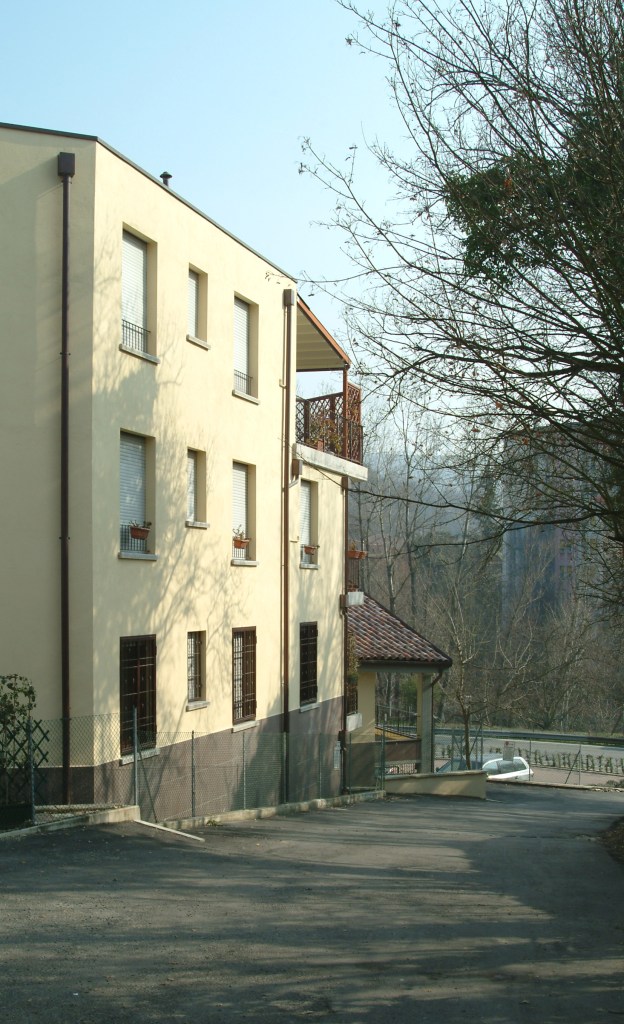 Il tema affrontato è stato quello della sostituzione urbanistica in quanto il complesso residenziale ha preso il posto di un precedente complesso a destinazione manufatturiera. Trovandosi l’intervento in zona di tutela ambientale e praticamente all’interno di un parco nelle prime colline di Bologna ci si è dovuti muovere con grande attenzione e sensibilità per non alterare il contesto e gli skyline esistenti. Si è lavorato all’interno della sagoma dell’edificio preesistente operando degli svuotamenti per creare un ampio cortile interno ove si affacciano alcuni locali delle unità immobiliari. Un attento uso e scelta dei materiali e una ricerca di soluzioni tecniche di alta qualità hanno consentito di ottenere un risultato di indubbia qualità : al privilegio di abitare in una zona assai verde e silenziosa si unisce un confort abitativo di assoluto rispetto. La soluzione planimetrica del progetto prevede 3 blocchi che si aggregano su un cortile centrale. La creazione di questo cortile da un lato ottiene lo scopo di dare maggiore ariosità al complesso. Non di meno si viene a creare una zona interna luminosa e silenziosa ove poter affacciare ambienti abitativi (zona notte, ecc.) che risulteranno assai silenziosi. I tre blocchi abitativi appoggiano tutti su una piattaforma di autorimesse interrate accessibili da una rampa posta sul lato nord dell’interrato. L’edificio si conforma in maniera sapiente ai molteplici vincoli progettuali non da ultimo alla particolare forma del lotto, che essendo di forma allungata risulta problematica ed inusuale.