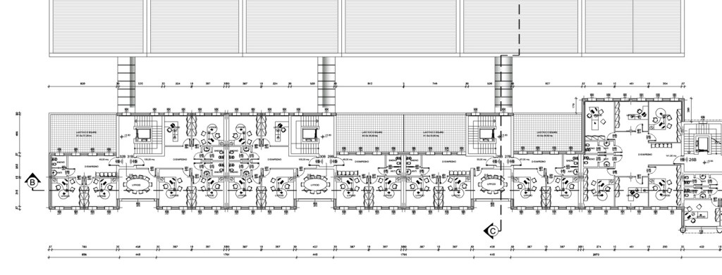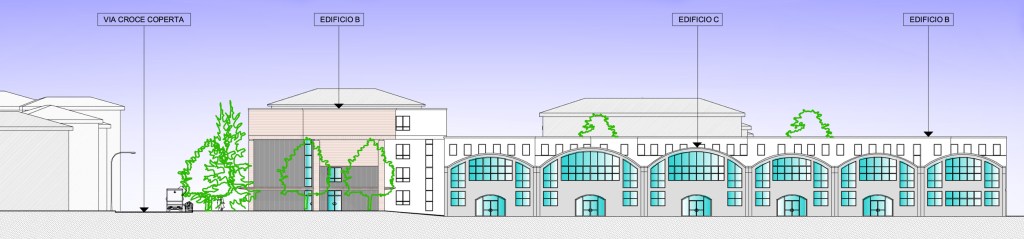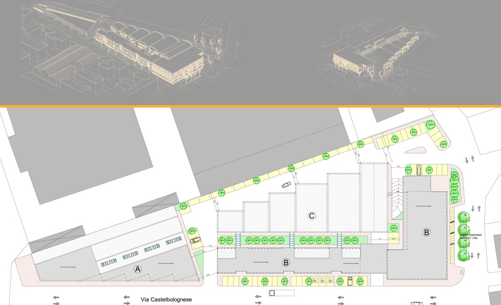 L’area oggetto di intervento si trova nella zona Nord di Bologna poco al di fuori dell’uscita del tangenziale, più precisamente all’incrocio tra via Croce Coperta e via Castelbolognese, quest’ultima attualmente a fondo cieco. Gli edifici presenti sul lotto di intervento costituivano un complesso industriale ora dismesso: allo stato attuale tali manufatti sono obsoleti e in evidente stato di degrado. Va da sé che il recupero di tali porzioni di città intercluse e abbandonate sia un obiettivo più che auspicabile per gli evidenti problemi di degrado ambientale che tale situazione comporta. Si è proposto un recupero e bonifica integrale dell’area proponendo un intervento di ristrutturazione edilizia all’interno della sagoma planivolumetrica esistente. Questo nel duplice intento di non alterare i profili consolidati in tale porzione di territorio senza rinunciare allo stesso tempo all’utilizzazione fondiaria già presente. Si è studiato con attenzione il posizionamento dei solai all’interno delle sagome esistenti al fine di ottimizzare le superfici esistenti rinunciando a quota della volumetria per creare quel minimo di viabilità interna al lotto che consentisse una agevole fruizione delle nuove unità. Gli usi proposti conservano una quota della tipologia di utilizzo preesistente quindi usi di tipo laboratoriale o magazzini (U9/U11) suddivise in unità di taglio medio-piccolo mentre sul fronte principale di via Croce Coperta e via Castelbolognese vengono proposti usi maggiormente qualificanti per l’intorno: U6 (negozi e commercio al dettaglio) al piano terra e U2 (uffici) ai piani superiori.